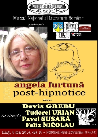 Lansarea cărţii mele de poezie Post-hipnotice, Ed. Timpul, 2013, care a avut loc la Rotonda de la Muzeul Naţional al Literaturii Române din Bucureşti în data de 6 mai ora 16, a reunit, alături de un public ce nu părea iniţial prea stimulat de discuţia teoretică, pe criticii şi artiştii Pavel Şuşară, Tudorel Urian, Felix Nicolau şi Devis Grebu, care au comutat abil accentul întâlnirii pe analiză, reflecţie şi jocul de idei. Unul dintre diagnosticele puse cărţii aparţine lui Felix Nicolau: “cu Post-hipnoticele Angelei Furtună, probabil că se lansează o nouă direcţie în literatura română: post-hipnotismul, care vine după alte experimente, precum himerismul sau delirionismul, şi e grefat pe un manifest ce incită la o lectură foarte complexă, făcută pe o interioritate profundă, în cadrul unui discurs poetic absolut diferit de tot ceea ce se scrie la noi la ora actuală, de ani buni”.
