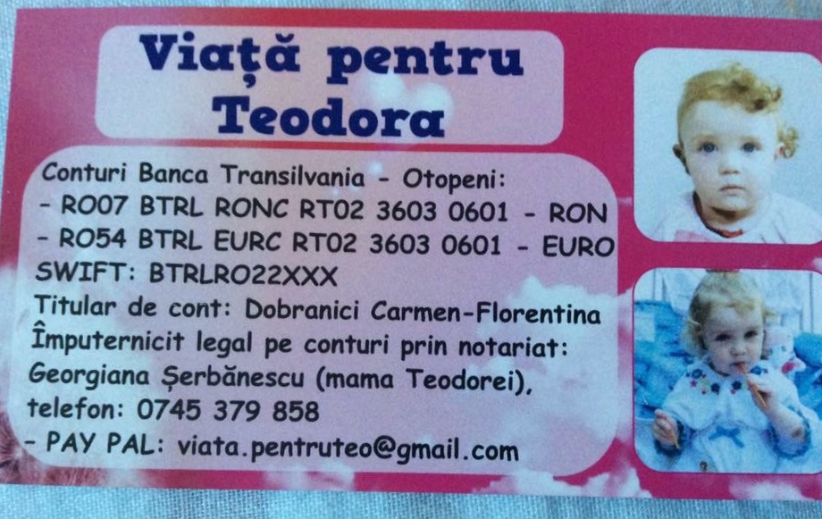 La doar 2 ani și câteva luni Teodora Serbănescu a trecut deja printr-o serie de operații din cauza unei boli congenitale de piele, care lăsată netratată ar fi putut provoca moartea. Ea locuiește în București, dar în 2014 familia ei a fost nevoită să vină în SUA să îi facă o serie de operații. Vara aceasta a revenit la Chicago pentru o nouă operație și am avut ocazia să ne vedem la picnicul românesc. Comunitatea din zonă a făcut în trecut strângere de fonduri pentru a sprijini familia cu cheltuielile de deplasare și operații. În prezent se simte bine însă va mai avea nevoie să revină în SUA pentru încă 4-5 operații.