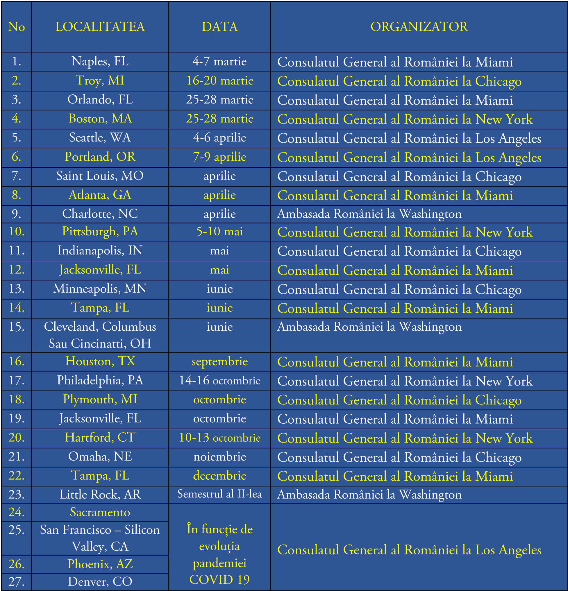 Ambasada României a anunțat că în urma consultărilor cu mediul asociativ românesc din Statele Unite a fost finalizat calendarul pentru organizarea consulatelor itinerante în Statele Unite ale Americii, pentru anul 2022.