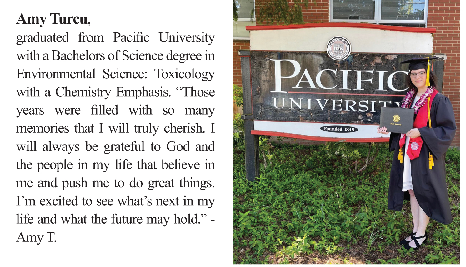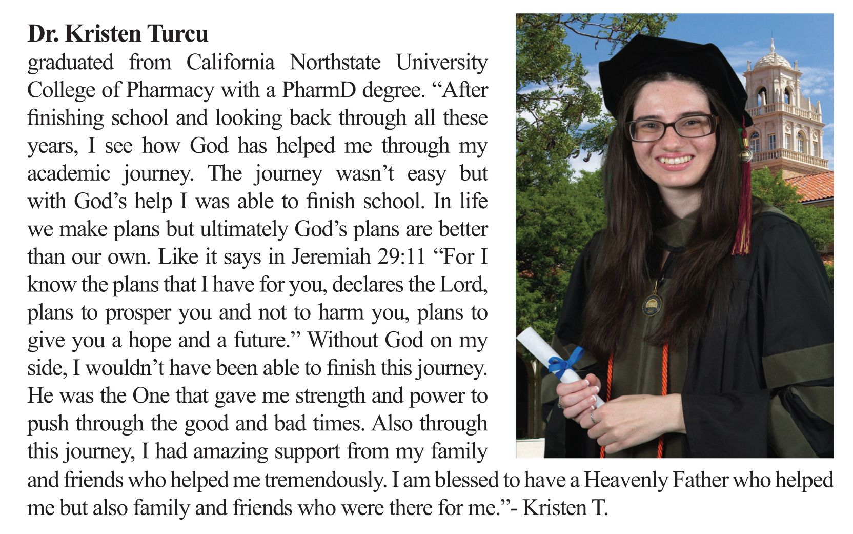 În ediția aceasta vă prezentăm doar trei absolvenți: surorile Amy Turcu și Dr. Kristen Turcu din Portland Oregon și Pastor Prof. Dr. Gabi Izsak.