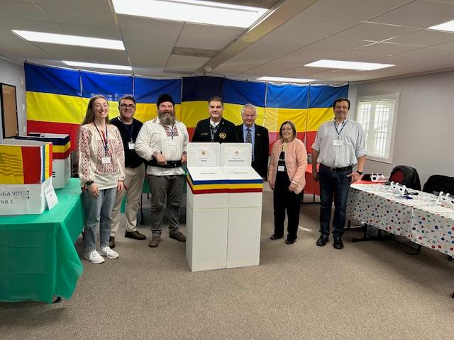 Membrii echipei biroului electoral 899 Portland Oregon la alegerile parlamentare din 1 decembrie 2024: (de la stânga la dreapta) Andreea Ioanăs. Marcel Urs, Cătălin Frandeș, Adrian O’Brian (Observator acreditat din partea ONU), Nelu Ciorba, Lucia McNeff, Mihai Zamfir.