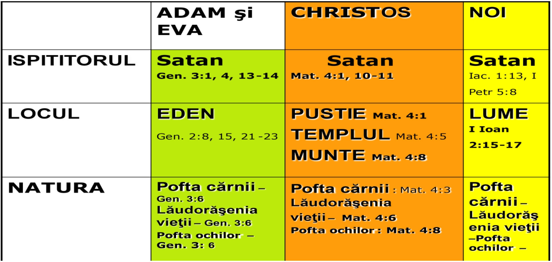 ,,Nimeni, când este ispitit, să nu zică: “Sunt ispitit de Dumnezeu”. Căci Dumnezeu nu poate fi ispitit ca să facă rău, şi El însuși nu ispitește pe nimeni. Ci fiecare este ispitit, când este atras de pofta lui însuși şi momit. (Iac. 1:13-14). (Alte texte: l Ioan 1:5-10; Romani 5-8; Galateni 5:16-23; Efeseni 2:1-4)